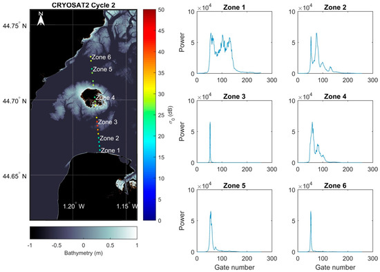 Spatial variation of the backscattering coefficient for CryoSat-2 (cycle 2) at low tide along with the corresponding waveforms of the indicated zones.