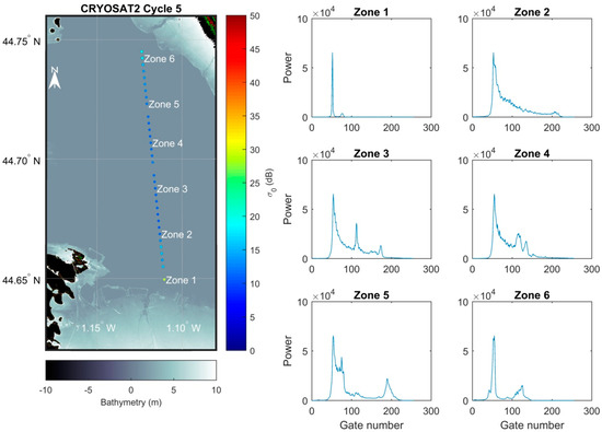 Spatial variation of the backscattering coefficient for CryoSat-2 (cycle 5) at high tide along with the corresponding waveforms of the indicated zones.