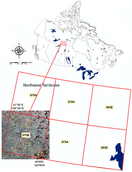 The area of interest is located in the southeast corner of the Northwest Territories, Canada and defined by National Topographic System map sheet 75B, Abitau Lake (Figure 1). This region is underlain by the high-grade metamorphic rocks of the South Rae geological province of the Canadian Shield [21]. Most of the region exceeds 500 m elevation, ranging from ~420 m to 575 m above sea level. Ridged to hummocky crystalline rocks form broad sloping uplands and lowlands. Bedrock exposure varies from 0 to 40%. Swaths of streamlined terrain (till), till veneers and blankets, and minor hummocky moraine comprised of sandy, silty till of varying composition and thickness dominate the upland cover. Lowlands are primarily filled with lakes and wetlands (organic deposits). Large esker systems cross the area, dominantly oriented northeast to southwest (esker-glacial landform is a long winding ridge composed of stratified sand and gravel, which was deposited by a subglacial or englacial meltwater stream). This region lies within the Selwyn Lake Upland ecoregion that extends northwest from the Churchill River in Manitoba to the East Arm Hills at the eastern end of Great Slave Lake [22] (Ecoregions Working Group, 1989). It is classified as having a low subarctic climate and is part of the boreal forest–tundra transition zone extending from Labrador to Alaska, with tree cover decreasing north–northwest. The characteristic vegetation consists of stuntd black spruce, dwarf birch and Labrador Tea, with a ground cover of lichen and moss. Poorly drained wetlands are dominated by bog–fen sequences of black spruce, ericaceous shrubs and mosses. Much of the area has been burned by forest fires over the past several decades and regrowth has been slow. Permafrost is extensive and discontinuous with low to medium ice content throughout the ecoregion. More detailed descriptions of the region’s geology and landscape can be found in [23] Campbell and Eagles [24], Pehrsson et al. [25], and Campbell et al. In this study, five subareas, within National Topographic System Abitau Lake map sheet 75B (Figure 1) were used.