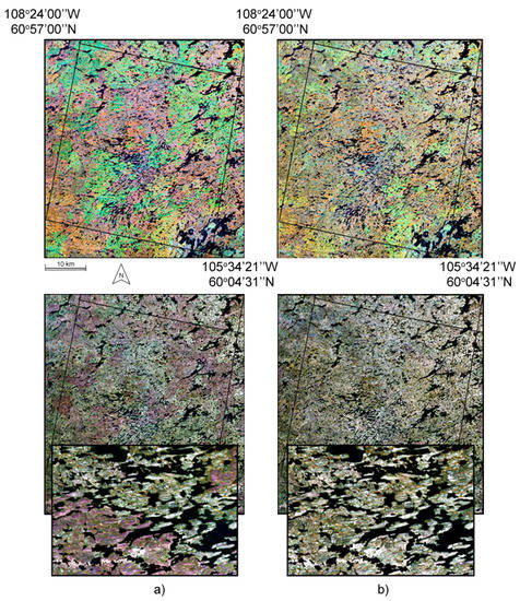 Landsat mosaics of National Topographic System map 75B: The image (a) shows the long-term average. The image (b) shows the long-term average with fire scars removed. The top image is RGB composite with near infrared band in red, shortwave infrared band in green and blue band in red. The bottom mosaics and the zoomed-in examples are true colour images composite as red band in red, green band in green, and blue band in blue.