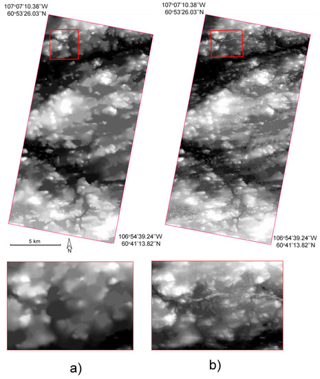 Another advantage of this processing approach was that it greatly improves image quality by averaging observations over multiple years. The blue band is usually too noisy to be used for analysis due to its strong sensitivity to atmosphere conditions. Nevertheless, Figure 3 shows an example of the blue band reflectance for both the best available measurement from the 2009–2011 composite, and the long-term average composite developed for use in this study. Much of the noise in the shorter-term composite has been removed using the described processing steps. Time series data processing provides a potential advantage as the blue band reflectance makes available specific information that improves classification of bedrock lithology and surficial materials. In addition to the band top of atmosphere reflectance, the Tasseled Cap Transformation (TCT) [29] was applied to produce Brightness, Greenness and Wetness orthogonal components, which allow for reduction of data dimensionality. The TCT was generated using coefficients provided by Huang et al. [30] for ETM and by Crist [31] for TM sensors.