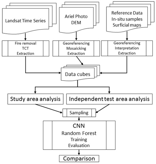 To simplify processing and analysis, data were organized over five subareas as data cubes (Figure 6). Each data cube contained all data layers used in the analysis, including Landsat bands, DEM, TCT, mosaicked air photos, surficial material classes, vegetation indices, land cover, etc. Data cubes were resampled into a common georeferencing framework with the same spatial resolution of 2 m. Initial exploratory analysis showed that the use of air photo data with 2 m spatial resolution was one of the more critical inputs to mapping accuracy. Landsat pixels (30 m) were replicated into 15 by 15 pixels with the same value. No resampling was applied because CNN convolution and pooling operations would achieve the optimal resampling for this application. Locations of the data cubes are depicted in Figure 5. They are referred to as North (N), Northwest (NW), South (S), Southwest (SW) and Southeast (SE). Based on this data structure, software was developed for efficient data manipulation such as creating training or testing samples with different sample sizes and features, evaluating and applying RF and CNN models, comparing classified images and deriving statistics.