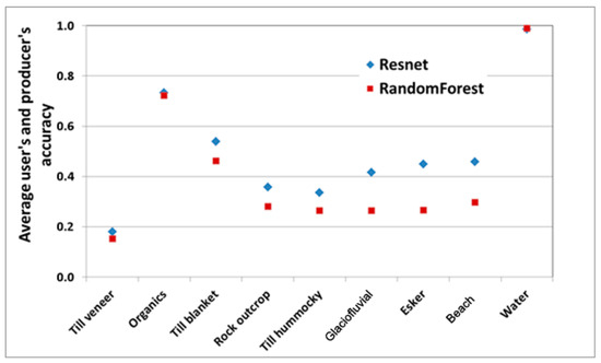 The results in Table 3 do not suggest a large improvement with RESNET. Overall accuracy is rather low reflecting difficulty of separating classes. This is due to the nature of the class distribution where the majority of the area consists of classes not strongly defined by spatial properties. These include organics, water, and till making up ~84% of the area. If we examine class specific accuracies (computed as the average of the user’s and producer’s accuracy), we see a greater improvement in the classes that are more defined by spatial structure such as hummocky till, eskers, and beaches, which improve on RF by 16% on average for the independent test sets results (Figure 8).