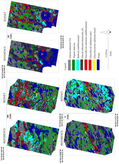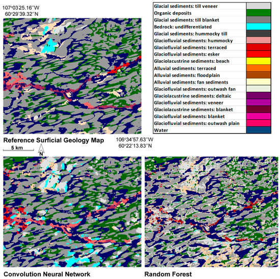 Subsets of the surficial materials maps generated by RF and RESNET are shown in Figure 9. Visual examination of the RESNET results with the surficial geology reference map suggests a reasonable general agreement that is consistent with the accuracy assessment (Table 3). In general, the spatial structure and main classes are reasonably well captured (Figure 9). The map generated by RF shows less agreement, particularly for the classes strongly defined by spatial properties.