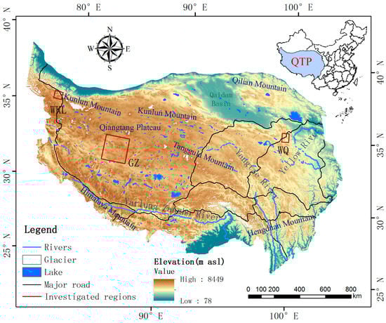 In order to evaluate the accuracy of this study, three investigated regions (Figure 1)-Western Kunlun (WKL), Wenquan (WQ), and Gaize (GZ) conducted from ‘the comprehensive investigation of permafrost and its environments on the QTP’ are selected as verification data. WKL (78.8°E~79.5°E, 35.6°N~36.1°N) (3508.1 km2) is located in the northwestern margin of the QTP [], and belongs to the typical mid-latitude alpine permafrost zone. GZ (84°E~86.03°E, 32.27°N~34°N) is located in the south the QTP and northeast of the Gaize county [], with altitude is between 4400 m and 6200 m asl and with area is 41,256 km2. WQ (99°60’E~99°42’E, 35°60’N~35°42’N) is located in the east of the QTP, area is about 2250 km2, the permafrost area accounted for the 66.7% of entire region []. Three investigated regions are located in the transition zones between permafrost and seasonally frozen ground with different climatic and geographic conditions. Permafrost maps of three investigated regions (IRs) are based on field survey data by employing geophysical exploration (Ground Penetrating Radar, GPR; Time-domain ElectroMagnetic, TEM), mechanical excavation, ground-based observations, and drilling method. Due to the elevation and terrain factors have much greater influence on permafrost presence/absence than that of longitude and latitude in the local region, those IRs permafrost maps were generated using the criteria of lower limits of permafrost in different conditions combined the DEM data and terrain factors (slope and aspect), and a portion of the observed results of geophysical methods and boreholes was reserved to validate the maps [,,]. The validation result of WQ investigated regions permafrost map shows an accuracy of 85.6% [].