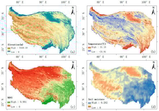 (a) Elevation of the Qinghai-Tibet Plateau; (b) The mean average surface temperature of 2003; (c) NDVI maximum in 2003; (d) Average soil moisture in May 2003.