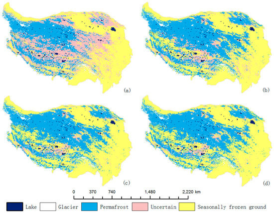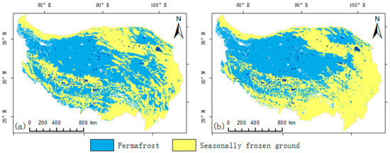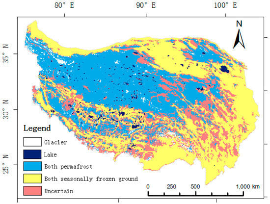Based on the two published permafrost maps (1:3,000,000 Map of Permafrost on the QTP and the permafrost map of the QTP derived from 1:4,000,000 Map of the Glaciers, Frozen Ground and Deserts in China), the permafrost agreeing in both maps is defined “both permafrost”, the seasonally frozen ground agreeing in both maps as “both seasonal frozen ground”, and the rest as uncertain class (Figure 4).