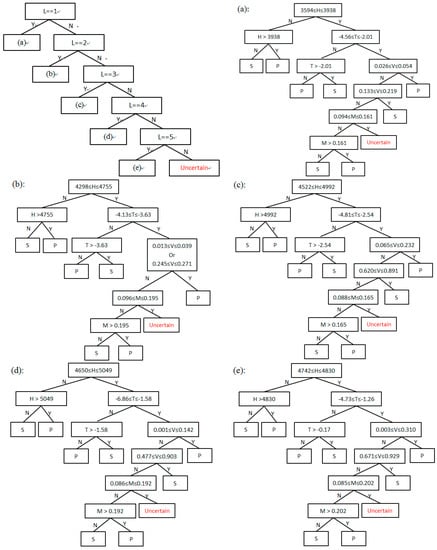 Classification Decision Tree (P: permafrost, S: seasonally frozen ground): (a) in the first latitude zone; (b) in the second latitude zone; (c) in the third latitude zone; (d) in the fourth latitude zone; and (e) in the fifth latitude zone.