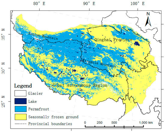(1) The 1:3,000,000 Map of Permafrost on the QTP (Figure 3a), which was compiled by State Key Laboratory of Frozen Soil Engineering, Northwest Institute of Eco-Environment and Resources, Chinese Academy of Sciences [] (hereafter referred to as “QTP96_map”) based on permafrost investigated data, literature, aerial photographs, satellite and others relevant maps; it shows the permafrost area of TP is 1.29 × 106 km2;