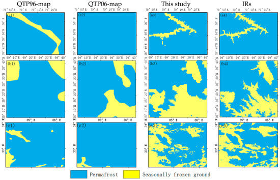 Permafrost distribution of the three investigated regions: West Kunlun (the first row), Wenquan (the second row), Gaize (the last row).