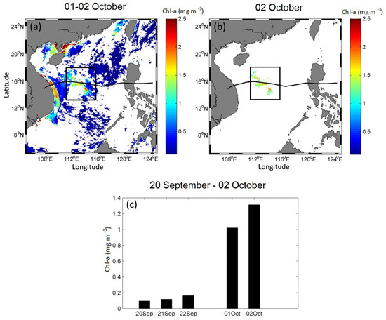 To determine Chl-a blooms after passages of typhoons (or storms), the areas showing maximum increases of Chl-a concentration along the typhoon (or storm) tracks are identified in satellite images. Figure 1 displays an instance of a Chl-a bloom in the SCS that was affected by a typhoon event (Ketsana in 2009). The black box shows the area of maximum Chl-a increase. Ketsana in 2009 originated from a tropical depression in the northwestern Pacific (128.80°E, 14.30°N) at 00:00 UTC on 25 September 2009 and strengthened to a category 1 typhoon with a maximum sustained wind (MSW) speed of 41 m·s−1 when it arrived east of Vietnam at 06:00 UTC on 28 September, with a mean translation speed of 4.2 m·s−1. Before the typhoon passed, the Chl-a level was low. After the typhoon, Chl-a concentration was substantially elevated southeast of Hainan Island on 1–2 October 2009 (Figure 1a). The maximum Chl-a concentration (Chl-amax) is determined (in the black box in Figure 1a), and the pixels showing Chl-a concentration in the range of (0.5~1.0)Chl-amax are selected (Figure 1b; 2 October 2009), and the average Chl-a concentration is calculated for this region. The Chl-a concentration in the range of (0.5~1.0)Chl-amax represents the value of a significant Chl-a bloom. Therefore, the Chl-a average for this region is defined as the daily elevated Chl-a value as induced by the typhoon forcing.