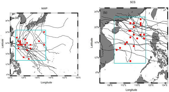 The typhoon tracks and the study areas in the NWP (a) and the SCS (b). The red squares show the locations with the maximum Chl-a increases after the typhoon passes along these typhoon tracks.