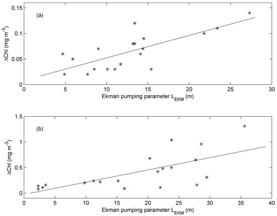 Figure 3 shows the Chl-a increase after typhoon passages versus the Ekman pumping parameter. High correlations are found between the Chl-a increase (ΔChl) and the Ekman pumping parameter (LEKM) using a linear regression for both the NWP and the SCS. In the NWP, the linear regression is given by
