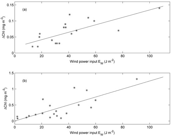 The Chl-a increase versus the wind power input parameter, EW is shown in Figure 4 for the NWP (a) and the SCS (b). The linear regression for the NWP is derived as follows