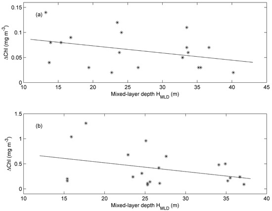 An important initial condition affecting the influence of a typhoon is the mixed-layer depth [30]. We explore the relationship between the Chl-a increase and the pre-typhoon mixed-layer depth. Figure 5 shows the Chl-a increase versus the mixed-layer depth for the different typhoon cases in the NWP (a) and the SCS (b). It is found that a negative correlation exists between the Chl-a increase and the MLD. The regression can be derived by the Chl-a and the MLD data listed in Table 1 and Table 2. For the NWP, the regression is given by