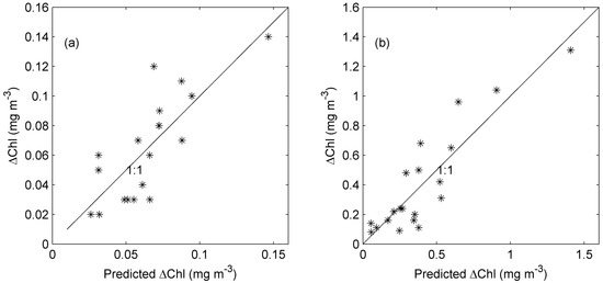 Table 1 and Table 2 show that the Chl-a increases are lower than the detection threshold of the Chl-a from satellite observations (e.g., 0.02 mg·m−3 in Table 1 and 0.08 mg·m−3 in Table 2). Since these Chl-a increase values in Table 1 and Table 2 are averaged over certain temporal and spatial ranges, the average process may substantially reduce the detection uncertainty for the satellite Chl-a, and also smooth the Chl-a values. The smoothed Chl-a values are lower than Chl-a bloom peaks. The maximum Chl-a increase in Table 2 (for the SCS) is below 1.5 mg·m−3, whereas the peak of the surface Chl-a bloom could be as high as ~3.0 mg·m−3 [41]. Although the Chl-a data used to develop the multi-parameter quantification model are below 1.5 mg·m−3 for the SCS, this data set may represent most of Chl-a bloom cases in the area. It is expected that with different regression coefficients, the multi-parameter quantification model could be applied in other regions.