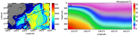 A section (the black line) across the NWP and the SCS in which the bathymetry is shown in color (a) and the climatological profiles of the nitrate concentration (μmol·L−1) in summer along the section (b).