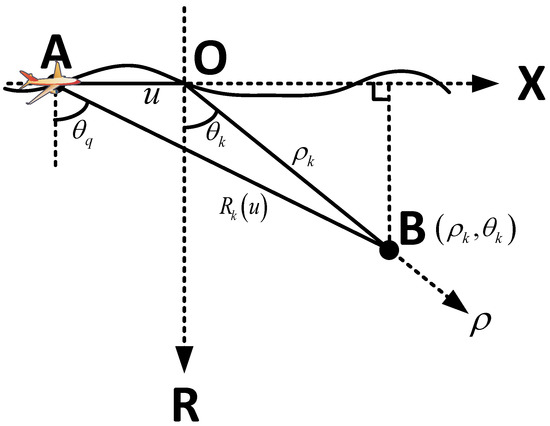 To image the ground scene-of-interest before the time when the airborne platform arrives, the radar LoS is directed with a forward squint angle (Figure 1). Suppose an arbitrary ground scatter is represented in a polar grid with the coordinates . When the airborne SAR flies along the predetermined track, the range from the airborne radar (Position A in Figure 1) to the scatter (Position B) can be given according to the cosine formula as: