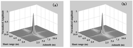 where = gives the wavenumber centroid, c is the speed of light, is the wavelength, = is the range resolution variation and ∈. The degradation in Equation (5) is explained as the APE [21], where the range error is evaluated by the wavelength . Therefore, the accuracy of the adjustment of APE can be interpreted by the radar wavelength. The APE commonly results in azimuthal focusing degradation, such as a widened main-lobe and increase sidelobes. Next, in Equation (6), the degradation is related to the azimuthal variable u and the range variable ; therefore, or is known as the NsRCM error, which is a 2D error function that will lead to both range defocusing, as well as the azimuth autofocusing degradation. By further noticing Equation (6), the range error is denoted with respect to the range resolution variation , which can therefore be known as that the accuracy of the alignment of NsRCM is related to the range resolution. Following the development of modern SAR, both high-resolution and high-accuracy SAR imaging performances are desired. Consequently, both APE and NsRCM errors are to be compensated for a well-focused SAR image.