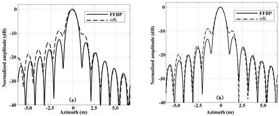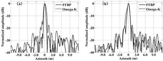 To prove the superiority of the proposed algorithm, the K algorithm as one of the most representative algorithms of the DPAs is employed for the comparison. Specifically, an extended version of the K algorithm as described in [6,22] is applied, for which it is easy to incorporate the data-driven auto-calibration. Figure 9 presents the azimuth responses of scatters processed by the proposed algorithm based on FFBP formation and the conventional algorithm based on the K formation [6,22]. The comparison of the center scatter is shown in Figure 9a, and that of the edge scatter is given in Figure 9b. From the comparison, it can be seen that the proposed FFBP-based algorithm is superior to the conventional extended K-based algorithm, where the processing result has narrower main-lobe and lower sidelobes. This is because FFBP, as one of the FTDBP algorithms, is employed for the image formation, and both radial and along-track motion errors are considered.