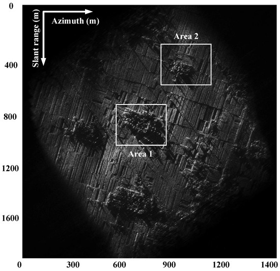 Employing the proposed algorithm, a well-focused SAR image is obtained and shown in Figure 13. The image has been transformed into the Cartesian grid. It can be noted that the motion error effects are removed, and a clear ground scene can be seen. Moreover, due to the SAR sensor working in squint mode, the buildings are obvious with the squint shadow in the SAR image.