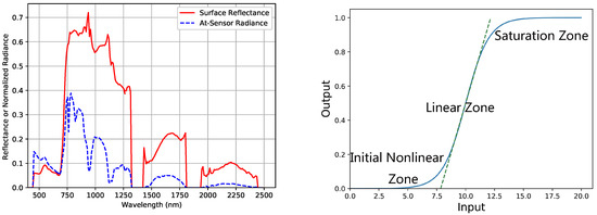 Hyperspectral images provide a complete spectrum for every pixel over the wavelength range from 0.4 to 2.5 μm, and the at-sensor radiance images contain absorption and scattering by atmospheric gases and aerosols. Atmospheric correction is a process in order to remove the atmospheric effects and retrieve the surface reflectance for further applications, such as land cover classification. A sample at-sensor radiance spectrum and the corrected reflectance spectrum from a typical hyperspectral sensor, called Airborne Visible Infrared Imaging Spectrometer (AVIRIS) [1], are shown in Figure 1.