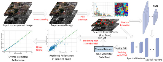 According to Equation (4), empirical methods estimate and from the observed images, and then the surface reflectance can be retrieved by . For example, ELM assumes that there are at least two known reflectance spectra within an image so that and can be easily calculated by a linear fitting which will be further explained in Section 2.6. However, the known reflectance spectra come from manual intervention which is not practical for automated correction. Fortunately, machine learning can solve this problem by automatically predicting the for several pixels after training on a labeled dataset (explained in Section 2.3, Section 2.4 and Section 2.5). Although we need corrected surface reflectance data when training the learning models, the trained models can predict reflectance for images from totally different spatial position and atmospheric conditions without additional metadata. To achieve this goal, the preprocessing (explained in Section 2.2) is necessary for input hyperspectral images. The flowchart of MLAC is illustrated in Figure 2.