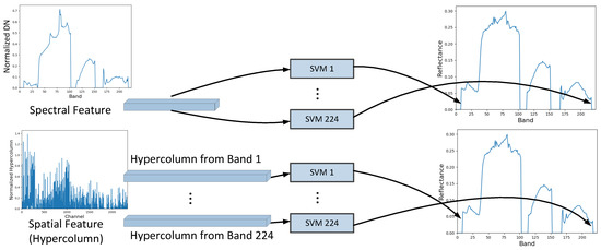 After feature extraction, SVM models are trained for predicting the surface reflectance from the extracted spectral or spatial feature. SVM was initially designed for classification based on the concept of support vector and decision plane. It has both strong theoretical foundations and abundant empirical successes. In the simplest form of SVM, the hyperplanes are optimized to separate the training data points by a maximal margin and the test data can be classified by these hyperplanes. The data vectors lying close to the hyperplanes are called support vectors. SVR (Support Vector Regression) [28] is an extension of SVM for handling regression problems and usually works with the kernel methods, which map the data into a higher-dimensional space to help handle the non-linear problems. We use the so-called epsilon-SVR [28] with Gaussian kernel to learn the relationship between the reflectance and the spectral and spatial features of all selected pixels. Totally, 224 SVR models are trained for 224 bands (see Figure 5). In addition, when training each model, the input instance data is the spectral or spatial feature descriptor of selected pixels in training set and the input label data is their corresponding surface reflectance of the specific band. The parameter optimization is implemented to find the best parameters for our problem, and the adjustment of parameters can help improve the regularization of SVM to avoid overfitting. After training, the surface reflectance of pixels in test set can be predicted very fast by the trained models.