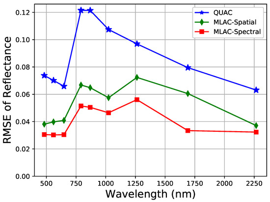RMSE of MLAC and QUAC. In the legends of the following figures, “MLAC-Spectral” and “MLAC-Spatial” represent MLAC based on the spectral feature descriptor and hypercolumn.