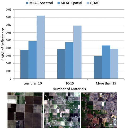 For convenience, the results of nine typical bands (482, 560, 647, 792, 870, 1024, 1263, 1691, and 2267 nm) which can well reflect the overall accuracy are illustrated in Figure 7 indicating that MLAC based on both spectral or spatial feature outperforms QUAC on a variety of scenes. To analyze the results on different scenes, the mean RMSE on all nine bands is calculated for each cropped scene. The result in Figure 8 shows that QUAC performs well on most scenes while being extremely bad on several specific scenes, which usually contain limited materials. To further understand the result, the test scenes are divided into three sets according to the number of materials (less than 10, 10–15, and more than 15) and the mean RMSE of nine bands is calculated on these sets, respectively. In addition, Figure 9 indicates that the performance of QUAC declines as the number of materials decrease in a scene. For scenes containing more than 15 materials, QUAC and MLAC have similar performance, but MLAC based on spectral feature is still the best of them. In a word, MLAC based on spectral and spatial features shows better robustness than QUAC on diverse scenes and the spectral-feature-based one still has better accuracy for scenes containing abundant materials. In addition, the ability to handle diverse scenes with different numbers of materials is very important for automatic retrieval of surface reflectance.