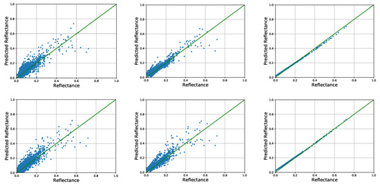 where and are the input and output arrays. n denotes the length of and , and the fitting equation is written as . It should be pointed out that the linear-fitting coefficients calculated from selected pixels are applicable for other pixels in the same cropped scene according to Equation (4). Furthermore, the linear fitting can be implemented on a group of cropped scenes together, if they are cropped from the same image indicating that they are acquired in a similar atmospheric condition. After the linear fitting, the reflectance of all pixels in the input image is predicted and MLAC is completed.