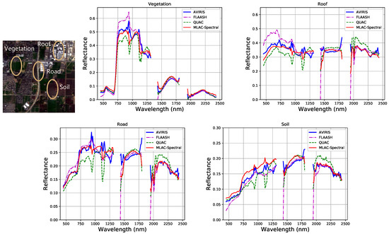 In test scene 52, we select four typical materials (vegetation, roof, road, and soil) and their spectra of all bands generated from MLAC based on spectral feature and QUAC are shown in Figure 12 for detailed comparison. The strong atmospheric absorption regions around 1400 and 1900 nm are excluded because the signal there is too weak. In Figure 12, the result of MLAC based on spectral feature surpasses QUAC on most spectra and the MLAC retrieved spectra have very good agreement with FLAASH and AVIRIS reflectance product. In addition, the result of FLAASH contains large error on some bands such as 780 nm compared with AVIRIS reflectance product. For MLAC, the relative accuracy of dark objects may seem bad, for the prediction offset may be comparable with the reflectance of dark objects. However, the post-processing can be specifically improved to further correct the prediction of dark objects in the future. Although there are also some bad predictions near the strong atmospheric absorption regions, on most bands, the predicted spectra of MLAC are close to the ground truth with absolute accuracy around 0.03 and practicable for further applications.