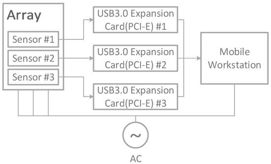 All sensors were locked on a tripod bar using a ball head, and connected to a mobile work station through a USB3.0 interface. Every sensor was allocated 5 Gbps bandwidth with a USB3.0 expansion card plugged in separate PCI-E slots; the connection is shown in Figure 2. Since the official software development kit (SDK) for Kinect V2 does not support more than one sensor, the open source drive OpenKinect [21] was used to power the three Kinect v2s to collect RGB-D data streams simultaneously. Although the Kinect V2 can obtain depth values for distances between 4.5 m to 9 m using the OpenKinect driver, those measurements (range > 4.5 m) are considered as low-quality data and are filtered out in the experiments using the threshold of 4.5 m suggested by the official driver. The intrinsic parameters of the Kinect V2 were provided by the manufacturer. However, according to published studies on the Kinect V2 [61], it is recommended to recalibrate those intrinsic parameters to guarantee the data accuracy. Additionally, sensor installation of the array involves assembly errors. Thus, intrinsic calibration of each individual Kinect and extrinsic calibration of the array is essential before use.