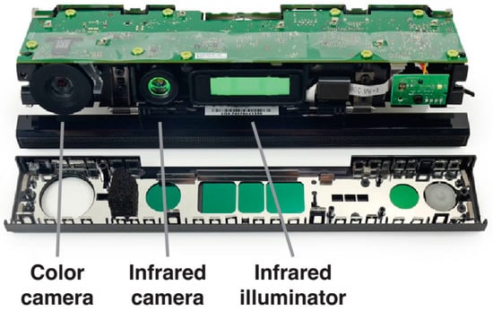 The optical system of the Kinect V2 is composed of a color camera with a resolution of 1920 × 1080 pixels, an infrared camera with resolution of a 512 × 424 pixels, and an infrared (IR) illuminator, as shown in Figure 3. The specifications of the Kinect V2 are listed in Table 1.