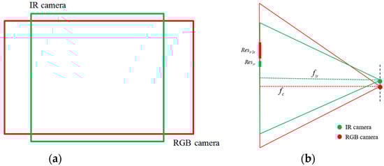 Determining the weights of the projection errors according to the IR and RGB image resolution. FOV: field of view. (a) Overlapped FOV of the IR and RGB cameras (Front view); (b) Top view of the layout of the IR and RGB cameras.