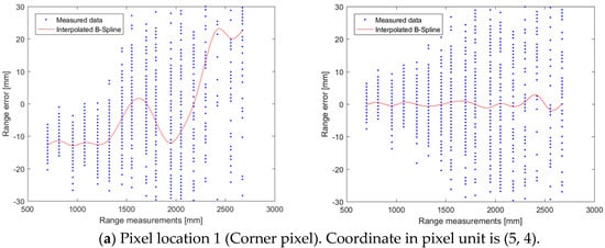 where , are the IR image width and height, respectively. , are the minimum and maximum validated measuring range (0.5 m, 4.5 m). Each matrix element which is the range bias of pixel location at different ranges () is fitted with a B-splines function , as written by Equation (14):