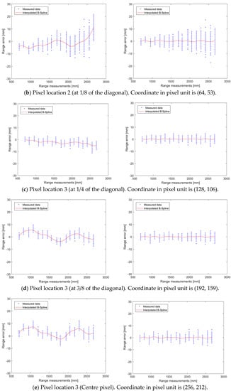 Range bias correction utilizing pixel-wise B-spline functions. The range errors before and after pixel-wise B-splines function fitting at pixel locations 1–5 are listed in the left and right rows, respectively.