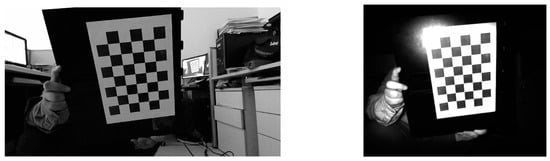 Color image (left, in grey scale) and IR image (right) for calibration with 5 × 7 × 0.03 checkerboard pattern.