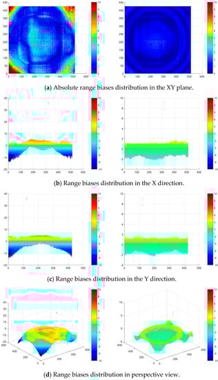 The main systematic errors = of a ToF sensor (including Kinect V2) is the systematic wiggling error that moves the range measurements toward or away from the sensor [49]. The Kinect V2 suffers from this kind of error in its range measurements because it calculates the distances from the phase difference of the returned signal. The reference signal is based on the theoretical assumption of a sinusoidal signal shape. Due to the limited electronics, the shapes of the modulated signals are not exactly sinusoidal, and in reality contain odd harmonic components. As a result, range bias appears as shown in Figure 5 (left column). The systematic wiggling range bias has been proven to be related to the object distance and spatial distribution of the pixel location deriving the range measurement on the image plane [9,50], and thus the range bias can be formulated as: