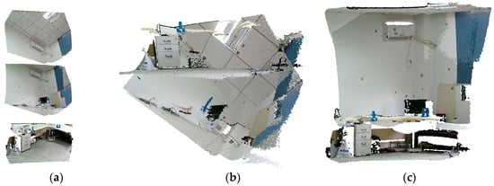 After the intrinsic calibration of each sensor in the array, the EoPs of each sensor were solved following the coarse-to-fine calibration method proposed in Section 3.3. Figure 9 illustrates the RGB-D camera array extrinsic calibration process. The color point clouds from the individual Kinects are in their own sensor coordinate reference frame. To fuse the three data streams (Figure 9a), extrinsic calibration of the sensors in the array was applied to generate the final data fusion results (Figure 9c).