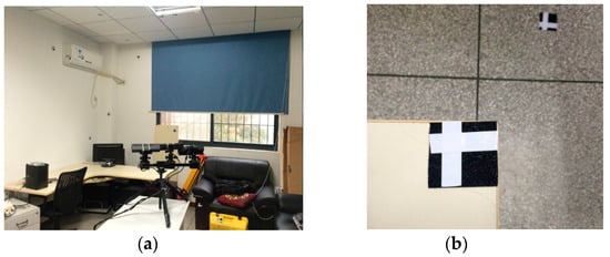The calibration field was built on a typical layout of an indoor scene that was a 2.5 × 2 × 3 m space consisting of two 90 degree intersected vertical walls and horizontal ceiling/floors (Figure 10a). Twenty high-contrast control targets were mounted on different surfaces facing various directions in the scene. The control targets were made of low-reflection black rough rubber and high-contrast smooth white plastic. Thus, the color contrast and the laser reflection intensity contrast were both taken into account for better significance in color RGB-D and laser point clouds. The snapshots of the control targets in the color images, TLS point clouds, and RGB-D point clouds are shown in Figure 10b–d.