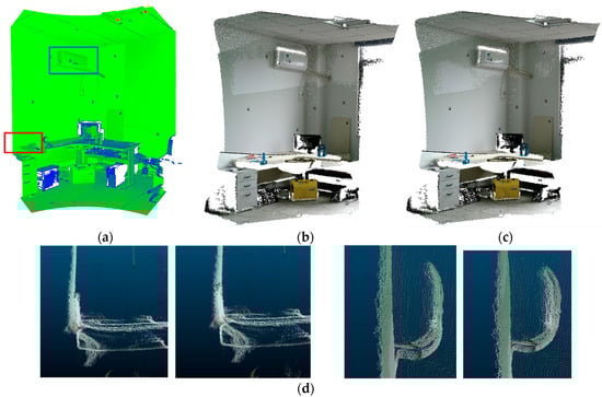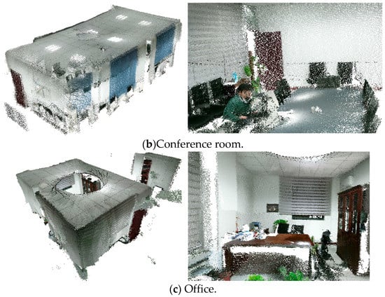 Typical indoor scenes were chosen for the RGB-D indoor mapping with the calibrated sensor array. The RGB-D camera array proposed in this paper is not equipped with any position and orientation sensors such as IMU. To solve the indoor localization problem, the real-time SLAM system of the real-time appearance-based mapping (RTAB-Map) [26,75,76] is adopted in this study. The RTAB-Map is a RGB-D SLAM solution that includes monocular vision odometry based on extracting key-points in key frames, an incremental appearance-based loop closure detector using bag of words (BoW) to distinguish whether the current location has been visited, and a global graph optimizer to achieve the bundle adjustment of the estimated pose parameters according to the found loop. However, RTAB-Map currently lacks support for three-band sensor array data input. Therefore, only the horizontally mounted RGB-D camera output stream was taken as the input of the SLAM algorithm; that is to say, the array exterior orientation parameters were solved by the horizontally mounted RGB-D data frame. The other two RGB-D data streams were converted to the mapping coordinate system of the RTAB-Map according to the calibration parameters calibrated in the aforementioned process. Typical indoor scenes’ point clouds collected by the proposed system are illustrated in Figure 15. It can be seen that the completeness of the point clouds is well maintained (especially the floor and ceiling). Benefiting from the large field view produced by the calibrated three-RGB-D camera structure, the proposed system delivers almost three times the data coverage compared with the single RGB-D mapping system. The workload of the manual operation and the number of the unknown EoPs needing to be solved by SLAM is reduced three times in the task of acquiring full-coverage 3D point clouds with auxiliary information (i.e., color) for indoor mapping.