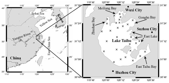 Maps of China’s inland Lake Taihu. Locations of the in situ TSM measurements. Between 2012 and 2016 are marked as “×” in Lake Taihu.
