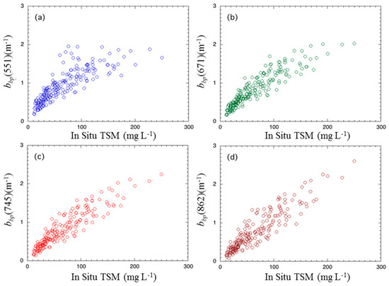 Scatter plots of in situ-derived bbp(λ) versus in situ TSM concentration in Lake Taihu for bbp(λ) at wavelengths of (a) 551 nm, (b) 671 nm, (c) 745 nm, and (d) 862 nm.
