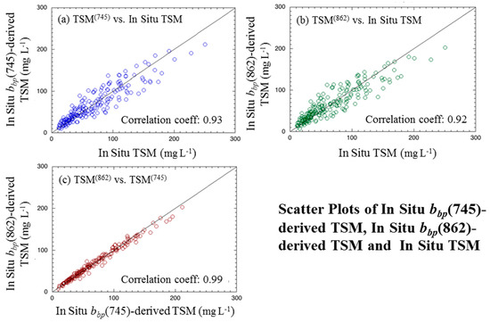 Scatter plots for (a) bbp(745)-derived versus in situ-measured TSM, (b) bbp(862)-derived versus in situ-measured TSM, and (c) bbp(862)-derived versus bbp(745)-derived TSM.