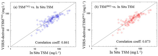 Scatter plots of (a) VIIRS bbp(745)-derived TSM(745) versus in situ-measured TSM and (b) VIIRS bbp(862)-derived TSM(862) versus in situ-measured TSM.