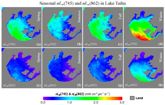 Seasonal climatology nLw(745) images (a–d) and nLw(862) images (e–h) for spring, summer, autumn, and winter from VIIRS 2012–2016 measurements, respectively.