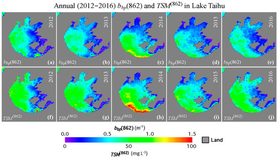 Previous studies show that the interannual variability of environmental parameters, such as Chl-a, Kd(490), and primary production in Lake Taihu can be significant [40,47]. Figure 7 shows the composite images of bbp(862) from 2012 to 2016. Even though those spatial patterns of bbp(862) between 2012 and 2016 are similar to each other, interannual variability of the bbp(862) is also remarkable. In Meiliang Bay and Gonghu Bay, low bbp(862) were observed in 2014 and 2015 in comparison with the other years. In 2014 and 2015, the mean bbp(862) in Meiliang Bay was about 0.3 m−1, while it reached over ~0.4 m−1 in the other years. Figure 7f–j show the corresponding TSM(862) in 2012–2016. In general, the spatial distributions of TSM(862) are similar to the spatial patterns of bbp(862) in each year. Enhanced TSM(862) over 100 mg/L was observed in southern Lake Taihu in the composite image of TSM(862) in 2014. In terms of TSM(862) for the entire Lake Taihu, 2014 was the least turbid year. In addition to bbp(862) and TSM(862) between 2012 and 2016, bbp(745) and TSM(745) (not shown here) show similar results as bbp(862) and TSM(862) in these years.