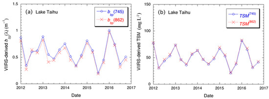 Figure 3c shows the matchup results between the TSM(745) and TSM(862). Indeed, they are consistent with each other with negligible differences (as expected). The correlation between TSM(745) and TSM(862) reaches over 0.99, and suggests that both TSM(745) and TSM(862) can be applied to VIIRS-derived nLw(λ) and bbp(λ) at the NIR bands 745 and 862 nm to characterize and quantify the TSM variability in Lake Taihu.