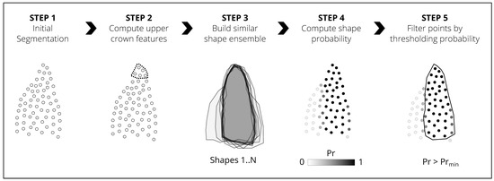 The proposed workflow starts with a set of ITC segments (obtained with any generic segmentation algorithm, such as marker controlled watershed [25,26,27]). Each segment is then characterized by a set of descriptive (geometric and radiometric) features and matched with similar segments to form ensembles (groups). Within each ensemble, the 3D alpha shapes (concave hulls) [28] derived from the point cloud segments are mutually overlaid to detect common regions and determine shape probability. A threshold is then applied to the probability, to filter out erroneous points from the initial segmentation.